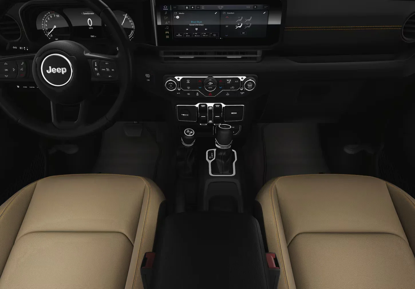 The 2025 Jeep Wrangler’s cabin continues to balance rugged durability with modern comfort. High-quality, weather-resistant materials withstand the elements, while available heated leather-trimmed seats and a heated, leather-wrapped steering wheel provide warmth and refinement on cold mountain mornings. For trail-ready resilience, wash-out flooring with removable carpet and drain plugs makes cleaning up after muddy adventures quick and easy. At the heart of the cabin, the largest-in-class 12.3-inch Uconnect® 5 touchscreen delivers seamless smartphone integration, available Wi-Fi® hotspot, navigation, and exclusive Jeep Adventure Guides powered by Trails Offroad. Ample smart storage solutions, from roomy door pockets to a versatile cargo area, ensure you’re ready for everything from weekday errands to weekend expeditions. With dual-zone automatic climate control, available ambient lighting, and a wide range of interior finishes, the 2025 Wrangler creates a cabin that’s as inviting as it is resilient—designed for comfort without compromising adventure.