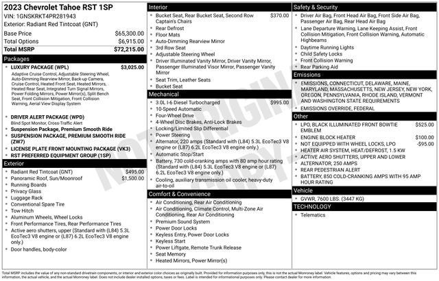 Northside Chevrolet Buick GMC is very proud to offer this handsome 2023 Chevrolet Tahoe RST in Radiant Red Tintcoat, beautifully equipped with Driver Alert Package (Lane Change Alert w/Side Blind Zone Alert and Rear Cross Traffic Alert), License Plate Front Mounting Package, Luxury Package (2nd Row Pwr Release 60/40 Split-Folding Bench Seat, 3rd Row 60/40 Power-Folding Split-Bench Seat, Adaptive Cruise Control, Enhanced Automatic Emergency Braking, HD Surround Vision, Heated 2nd Row Outboard Seats, Heated Steering Wheel, Memory Settings, Outside Heated Power-Adjustable Mirrors, Power Tilt & Telescopic Steering Column, and Rear Pedestrian Alert), Preferred Equipment Group 1SP (1st & 2nd Row Color-Keyed Carpeted Floor Mats, Auto-Dimming Inside Rear-View Mirror, Bose 9-Speaker Stereo Audio System Feature, Bright Front & Rear Door Sill Plates, Color-Keyed Carpeting Floor Covering, Driver & Front Outboard Passenger Airbags, Enhanced Driver Information Center, Floor Console w/Storage Area, Hands-Free Rear Power Programmable Liftgate, Infotainment Display, LED Daytime Running Lamps, Memory Settings for Driver, Remote Start, SiriusXM Radio w/360L, Universal Home Remote, Wireless Charging, and Wrapped Steering Wheel), 4WD, Jet Black/Victory Red Leather, 1.5 kW Heater/Defrost Air System, 10-Way Power Driver & Passenger Seat Adjusters, 250-Amp Alternator, 3.23 Rear Axle Ratio, 3rd row seats: split-bench, 4-Wheel Disc Brakes, 850 Cold-Cranking Amps Battery, 9 Speakers, ABS brakes, Air Conditioning, Alloy wheels, AM/FM radio: SiriusXM with 360L, Apple CarPlay/Android Auto, Auto High-beam Headlights, Auto-dimming Rear-View mirror, Automatic temperature control, Black Illuminated Front Bowtie Emblem (LPO), Brake assist, Bumpers: body-color, Compass, Delay-off headlights, Diesel B20 Fuel, Driver door bin, Driver vanity mirror, Dual front impact airbags, Dual front side impact airbags, Dual-Pane Power Panoramic Sunroof, Electronic Stability Control, Emergency communication system: OnStar and Chevrolet connected services capable, Engine Block Heater, Four wheel independent suspension, Front anti-roll bar, Front Bucket Seats, Front Center Armrest, Front dual zone A/C, Front High-Back Reclining Bucket Seats, Front reading lights, Fully automatic headlights, Garage door transmitter, Heated door mirrors, Heated Driver & Front Passenger Seats, Heated front seats, Illuminated entry, Low tire pressure warning, Memory seat, Navigation System, Not Equipped w/Wheel Locks (LPO), Occupant sensing airbag, Outside temperature display, Overhead airbag, Overhead console, Panic alarm, Passenger door bin, Passenger vanity mirror, Perforated Leather Seat Trim, Power door mirrors, Power driver seat, Power Liftgate, Power passenger seat, Power Release 2nd Row Bucket Seats, Power steering, Power windows, Premium audio system: Chevrolet Infotainment 3 Premium, Premium Smooth Ride Suspension, Radio: Chevrolet Infotainment 3 Premium System, Rain sensing wipers, Rear air conditioning, Rear anti-roll bar, Rear reading lights, Rear seat center armrest, Rear window defroster, Rear window wiper, Remote keyless entry, Roof rack: rails only, Security system, Set of 4 Wheel Locks (LPO), Speed control, Speed-sensing steering, Split folding rear seat, Spoiler, Steering wheel mounted audio controls, Tachometer, Telescoping steering wheel, Tilt steering wheel, Traction control, Trip computer, Upper & Lower Active Aero Shutters, Variably intermittent wipers, Voltmeter, and Wheels: 22 x 9 Bright Machined! 4WD, Jet Black/Victory Red Leather.
