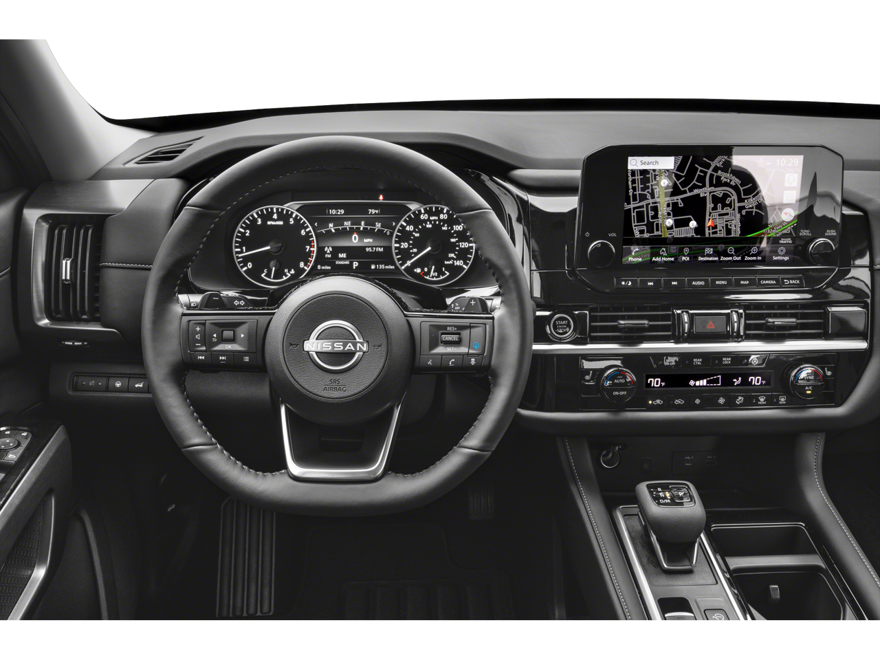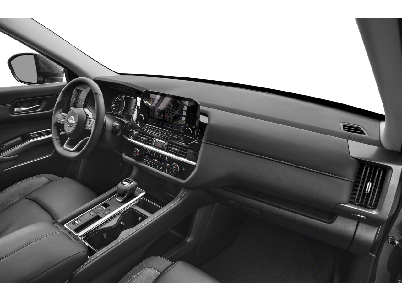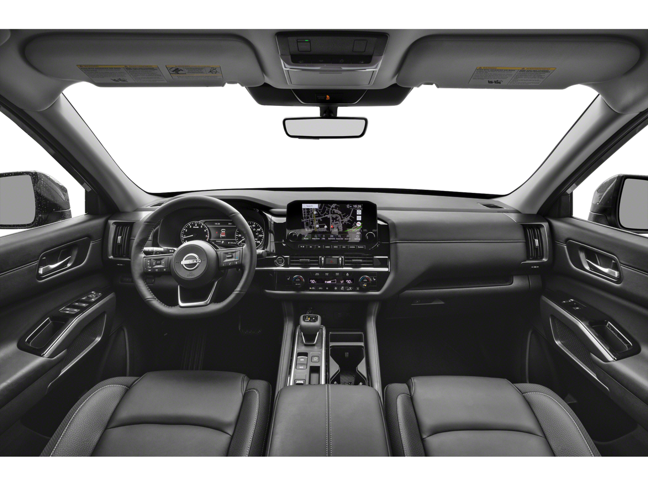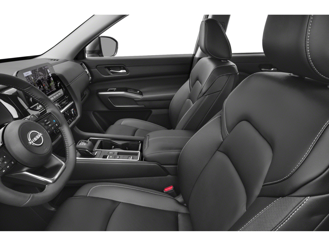 The exterior of the Pathfinder SL exudes a bold, sophisticated style with its sleek lines, striking black accents, and 20-inch painted alloy wheels. Step inside and you'll be greeted by a spacious, well-appointed cabin featuring premium leather-appointed seating, a heated steering wheel, and a panoramic moonroof that floods the interior with natural light.