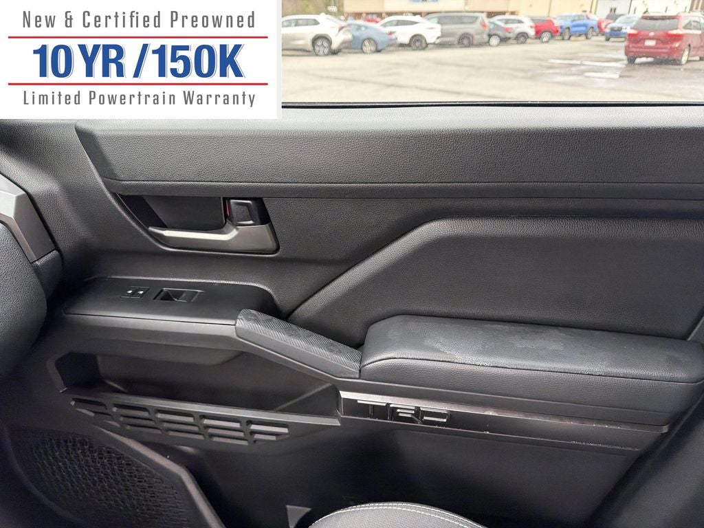 - Checked Features: 6 Speakers, AM/FM radio: SiriusXM, Radio: 8 Toyota Audio Multimedia, Air Conditioning, Automatic temperature control, Rear window defroster, Power steering, Power windows, Remote keyless entry, Steering wheel mounted audio controls, Four wheel independent suspension, Speed-sensing steering, Traction control, 4-Wheel Disc Brakes, ABS brakes, Anti-whiplash front head restraints, Dual front impact airbags, Dual front side impact airbags, Emergency communication system: Safety Connect (1-year trial), Front anti-roll bar, Knee airbag, Low tire pressure warning, Occupant sensing airbag, Overhead airbag, Brake assist, Electronic Stability Control, Exterior Parking Camera Rear, Auto High-beam Headlights, Front fog lights, Fully automatic headlights, Panic alarm, Security system, Speed control, Bumpers: body-color, Heated door mirrors, Power door mirrors, Rear step bumper, Turn signal indicator mirrors, Apple CarPlay/Android Auto, Auto-dimming Rear-View mirror, Driver door bin, Driver vanity mirror, Front reading lights, Illuminated entry, Leather Shift Knob, Leather steering wheel, Outside temperature display, Overhead console, Passenger vanity mirror, Tachometer, Telescoping steering wheel, Tilt steering wheel, Trip computer, Fabric Seat Trim, Front Bucket Seats, Front Center Armrest, Split folding rear seat, Passenger door bin, Alloy wheels, Wheels: 17 TRD Off-Road Alloy, Variably intermittent wipers, 3.583 Axle Ratio.